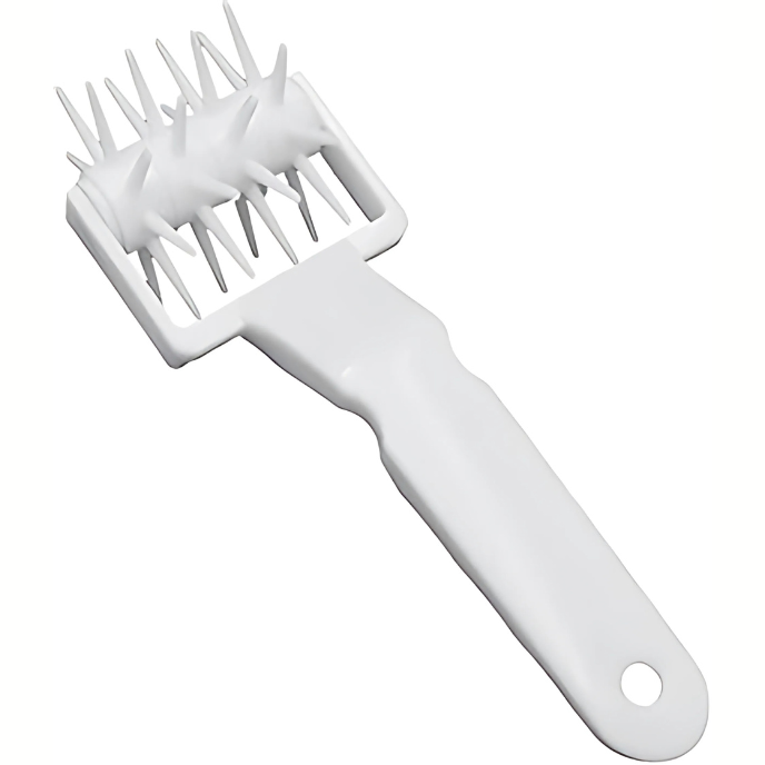 The Plastic Pizza Dough Docker is an essential baking tool for ensuring evenly baked pizza crusts. Its sharp perforating wheels prevent air bubbles by docking the dough before baking, resulting in consistent, professional-quality pizzas.